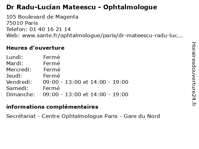 1 Dr Bilal Romdhane - Ophtalmologue (Distance: 0,00 km) 105 Boulevard de Magenta, 75010 Paris bilal, consultation, docteur, dr, med, médecin, ophtalmologue, romdhane, traitement 2 Dr Ioana-Alexandra Mateescu - Ophtalmologue (Distance: 0,00 km) 105 Boulevard de Magenta, 75010 Paris alexandra, consultation, docteur, dr, ioana, mateescu, med, médecin, ophtalmologue, traitement 3 Dr Irene De Rosa - Ophtalmologue (Distance: 0,00 km) 105 Boulevard de Magenta, 75010 Paris consultation, de, docteur, dr, irene, med, médecin, ophtalmologue, rosa, traitement 4 Dr Herve Mimoun - Ophtalmologue (Distance: 0,00 km) 105 Boulevard de Magenta, 75010 Paris consultation, docteur, dr, herve, med, mimoun, médecin, ophtalmologue, traitement 5 Dr Hong Liang - Ophtalmologue (Distance: 0,33 km) 82 Rue d'Hauteville, 75010 Paris docteur, dr, hong, liang, médecin, ophtalmologie, ophtalmologue 6 Dr Alexandre Pedinielli - Ophtalmologue (Distance: 0,33 km) 82 Rue d'Hauteville, 75010 Paris alexandre, docteur, dr, médecin, ophtalmologie, ophtalmologue, pedinielli |