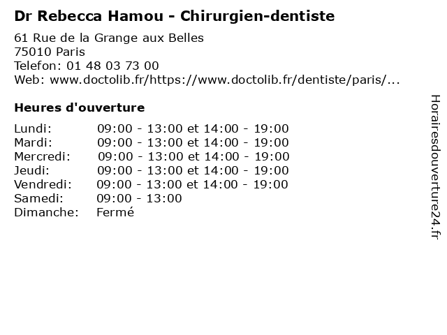 1 Dr Rebecca Hamou - Chirurgien-dentiste (Distance: 0,00 km) 61 Rue de la Grange aux Belles, 75010 Paris chirurgien, dentiste, dr, hamou, médecin, médecine, médical, pharmaceutique, rebecca, traitement 2 Dr Carole Karcenty-Hamou - Chirurgien-dentiste (Distance: 0,00 km) 61 Rue de la Grange aux Belles, 75010 Paris carole, chirurgien, consultation, dentiste, docteur, dr, hamou, karcenty, med, médecin, médecine, secrétariat, traitement 4 Benjamin Hamou - Ostéopathe (Distance: 3,17 km) 25 Rue Tronchet, 75008 Paris benjamin, care, clinic, dentist, france, gynécologue, hamou, health, kinesitherapeute, ophtalmologiste, orl, ostéopathe, psychologue, service 5 Dr Abner Hamou - Médecin généraliste (Distance: 6,44 km) 191 Rue d'Alésia, 75014 Paris abner, docteur, dr, generaliste, généraliste, hamou, medical, médecin, soin 6 Dr Adrien Ben Hamou -Radiologue (Distance: 7,43 km) 6 Rue Pierre Louys, 75016 Paris adrien, ben, diagnostique, dr, hamou, imagerie, radiologie, radiologue, thérapeutique |