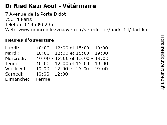 1 Cabinet Vétérinaire (Distance: 0,01 km) 7 avenue de la porte Didot, 75014 Paris aoul, cabinet, clinique, kazi, riad, services, veterinaires, vétérinaire 3 Clinique Vétérinaire Lacroix (Distance: 2,82 km) 24 Avenue de Breteuil,, 75007 Paris animal, clinic, clinique, lacroix, veterinarian, vétérinaire 4 Dr Chloé Lacroix - Vétérinaire (Distance: 2,83 km) 18 Rue d'Estrées, 75007 Paris animaux, chloé, clinique, dr, lacroix, médical, santé, soins, vétérinaire 5 Riad Arago Coiffure (Distance: 2,95 km) 31 Boulevard Arago, 75013 Paris arago, cheveux, coiffeur, coiffure, riad 6 |
