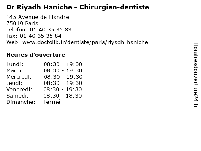 1 Dr Riyadh Haniche - Chirurgien-dentiste (Distance: 0,00 km) 145 Avenue de Flandre, 75019 Paris chirurgien, chirurgien-dentiste, dentiste, dr, haniche, médecins, médicaments, riyadh, santé, secrétariat, spécialiste 2 Dr Riyadh Bouchekioua - Chirurgien-dentiste (Distance: 2,87 km) 42 Rue de Paris, 93260 Les Lilas bouchekioua, chirurgien, consultation, dentiste, docteur, dr, med, médecin, médecine, orthodontiste, riyadh, secrétariat, traitement 3 Dr Riyadh Bouchekioua - Chirurgien-dentiste (Distance: 2,93 km) 42 Rue de Paris, 93260 Les Lilas bouchekioua, chirurgien, consultation, dentiste, docteur, dr, med, médecin, médecine, orthodontiste, riyadh, secrétariat, traitement 4 Dr Riyadh Bouchekioua - Chirurgien-dentiste (Distance: 9,37 km) 36 Avenue Frédéric Joliot-Curie, 95140 Garges-lès-Gonesse bouchekioua, centre, chirurgien, dentaire, dentiste, dr, d’orthodontie, garges, gonesses, implantologie, les, louise, orthodontiste, parodontologie, riyadh 5 Dr Riyadh Bouchekioua - Chirurgien-dentiste (Distance: 30,30 km) 65 Avenue Paul Vaillant-Couturier, 78190 Trappes bouchekioua, chirurgien, consultation, dentiste, docteur, dr, med, médecin, riyadh, traitement 6 Abitbol Elie (Distance: 4,53 km) 61 rue Rivoli,, 75001 Paris abitbol, chirurgien dentiste, docteurs soin dentaire, elie |