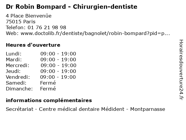 1 Dr Robin Bompard - Chirurgien-dentiste (Distance: 2,36 km) 15 Rue du Puits de l'Ermite, 75005 Paris bompard, chirurgien, consultation, dentiste, docteur, dr, med, médecin, robin, traitement 2 Bibliothèque Léon-Robin (Distance: 1,85 km) 1 Rue Victor-Cousin, 75005 Paris bibliothèque, livre, léon, médiathèque, robin, services, université 3 Christophe Robin (Distance: 2,61 km) 228 Rue de Rivoli, 75001 Paris christophe, hair salon, robin, salon 4 Dr. Robin Stéphanie - Ostéopathe (Distance: 2,79 km) 17 Rue Sadi Carnot, 92120 Montrouge docteur, dr., medecins, ostéopathe, robin, sante, stéphanie 5 Dr. Robin Michel - Pediatrics (Distance: 5,41 km) 4 Boulevard Victor Hugo, 92200 Neuilly-sur-Seine docteur, dr., medecins, michel, pediatrics, robin, sante 6 Square Paul Robin (Du 29 octobre au 28 février) (Distance: 6,52 km) 10 place Hebert, 75018 Paris 28, 29, au, du, février, jardin, octobre, parc, paul, robin, square |