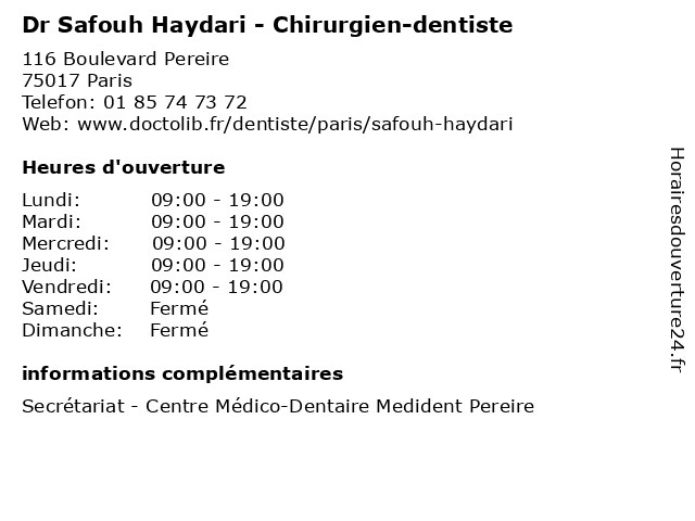 1 Dr Safouh Haydari - Chirurgien-dentiste (Distance: 1,80 km) 45 Rue la Boétie, 75008 Paris chirurgien, dent, dentiste, docteur, dr, haydari, safouh, soins 2 Aryana Haydari - Ostéopathe (Distance: 17,57 km) 13 Avenue de la République, 91430 Igny aryana, haydari, ostéo, ostéopathe, ostéopathes, soins 3 Dr Abu Higeleh - Chirurgien-dentiste (Distance: 0,00 km) 116 Boulevard Pereire, 75017 Paris abu, chirurgie, chirurgien, dentaire, dentiste, dr, higeleh 4 Dr Justin Oosthoek - Orthodontiste (Distance: 0,00 km) 116 Boulevard Pereire, 75017 Paris 75017, centre, dentaire, dr, justin, médico, oosthoek, orthodontiste, paris, pereire 5 Dr Jacques Maarek - Stomatologue (Distance: 0,38 km) 139 Avenue de Villiers, 75017 Paris dentaire, dr, implantologie, jacques, maarek, parodontologie, stomatologue 6 Dr Valentina Guichard - Chirurgien-dentiste (Distance: 0,63 km) 68 Rue Bayen, 75017 Paris cabinet, chirurgien, de, dentaire, dentiste, dr, guichard, implantologie, la, maillot, parodontologie, porte, valentina |