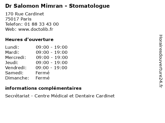 1 Dr Salomon Mimran - Stomatologue (Distance: 5,40 km) 46 Rue de Crimée, 75019 Paris dr, mimran, médecin, médecine, médical, pharmaceutique, salomon, stomatologue, traitement 2 Dr Salomon Mimran - Stomatologue (Distance: 7,90 km) 250 Rue de Charenton, 75012 Paris consultation, docteur, dr, med, mimran, médecin, salomon, stomatologue, traitement 3 Dr Salomon Mimran - Stomatologue (Distance: 8,28 km) 95 Avenue Verdier, 92120 Montrouge dr, mimran, médecin, médecine, médical, pharmaceutique, salomon, stomatologue, traitement 4 Dr Salomon Mimran - Stomatologue (Distance: 9,71 km) 41 rue Verdun, 94220 Charenton le Pont consultation, docteur, dr, med, mimran, médecin, médecine, salomon, stomatologue, traitement 5 Dr Salomon Mimran - Stomatologue (Distance: 15,07 km) 5 Avenue Pierre Brossolette, 94000 Créteil dentaire, dr, implantologie, mimran, parodontologie, salomon, stomatologue 6 Dr Salomon Mimran - Stomatologue (Distance: 19,30 km) 125 Avenue de Général Leclerc, 95480 Pierrelaye dentaire, dr, implantologie, mimran, parodontologie, salomon, stomatologue |