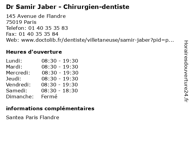 1 Dr Samir Jaber - Chirurgien-dentiste (Distance: 0,00 km) 145 Avenue de Flandre, 75019 Paris chirurgien, consultation, dentiste, docteur, dr, jaber, med, médecin, médecine, samir, secrétariat, traitement 2 Dr Samir Jaber - Chirurgien-dentiste (Distance: 12,15 km) 128 Rue Jean Jaurès, 95870 Bezons bezons, centre, chirurgien, de, dentaire, denteclair, dentiste, dr, implantologie, jaber, parodontologie, samir 3 Dr Samir Jaber - Chirurgien-dentiste (Distance: 12,38 km) 3 Allée Sainte-Lucie, 92130 Issy-les-Moulineaux chirurgien, consultation, dentiste, docteur, dr, jaber, med, médecin, samir, traitement 5 Bezzeghoud Samir (Distance: 4,10 km) Etage 1Er, 75018 Paris bailleurs, bezzeghoud, biens, immobiliers, nra, samir 6 Dr Samir Bouied - Chirurgien-dentiste (Distance: 4,44 km) 31 Rue de Caumartin, 75009 Paris bouied, chirurgien, dentiste, dr, médecin, médecine, médical, pharmaceutique, samir, traitement |