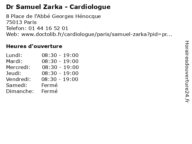 1 Dr Frédéric Sebag - Cardiologue (Distance: 0,00 km) 8 Place de l'Abbé Georges Hénocque, 75013 Paris cardiologue, dr, frédéric, médecins, médicaments, santé, sebag, secrétariat, spécialiste 2 Dr Nicolas Ivanoff - Cardiologue (Distance: 0,00 km) 8 Place de l'Abbé Georges Hénocque, 75013 Paris cardio, cardiologie, cardiologue, coeur, dr, ivanoff, nicolas 3 Dr Jean-Marc Darondel - Cardiologue (Distance: 0,00 km) 8 Place de l'Abbé Georges Hénocque, 75013 Paris cardiologue, consultation, darondel, docteur, dr, jean, marc, med, médecin, traitement 4 Dr Edouard Simeon - Cardiologue (Distance: 0,00 km) 8 Place de l'Abbé Georges Hénocque, 75013 Paris cardiologue, consultation, docteur, dr, edouard, med, médecin, simeon, traitement 5 Dr Anne Lavergne - Cardiologue (Distance: 0,01 km) 8 Place de l'Abbé Georges Hénocque, 75013 Paris anne, cardiologue, consultation, docteur, dr, lavergne, med, médecin, médecine, secrétariat, traitement 6 Dr François Guillerm - Cardiologue (Distance: 0,43 km) 21 Rue du Moulinet, 75013 Paris cardiologue, dr, françois, guillerm, médecin, médecine, médical, pharmaceutique, traitement |