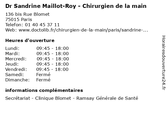 1 Dr Sandrine Maillot-Roy - Chirurgien de la main (Distance: 4,80 km) 20 Rue Laffitte, 75009 Meudon chirurgien, de, dr, la, maillot, main, médecins, médicaments, roy, sandrine, santé, secrétariat, spécialiste 2 Dr Sandrine Maillot-Roy - Chirurgien de la main (Distance: 7,67 km) 3 Avenue de Villacoublay, 92360 Meudon chirurgien, de, dr, la, maillot, main, médecins, médicaments, roy, sandrine, santé, secrétariat, spécialiste 3 Sandrine Taulere - Psychologue (Distance: 0,36 km) 87bis Rue Blomet, 75015 Paris psy, psychiatre, psychologue, sandrine, sante, soins, taulere 4 L'Infinithé - Chez Sandrine (Distance: 0,43 km) 8 Rue Desnouettes, 75015 Paris chez, infinithe, l'infinithé, letestu, parisiennes, restaurants, sandrine, tartes 6 Sandrine Kreckelbergh - Psychologue (Distance: 0,66 km) 2 Rue François Coppée, 75015 Paris cabinets, kreckelbergh, médecins, psychologue, sandrine, secrétariat, thérapies |