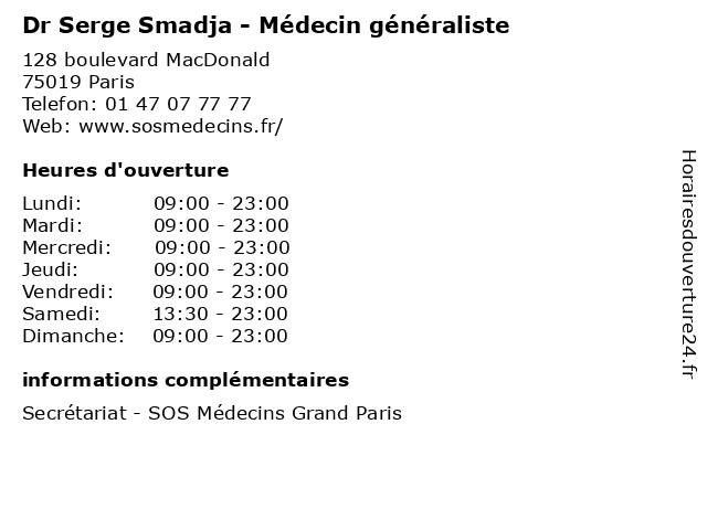 1 Dr Serge Charbite - Médecin généraliste (Distance: 0,00 km) 128 boulevard MacDonald, 75019 Paris charbite, consultation, docteur, dr, généraliste, med, médecin, serge, traitement 2 Paroisse Saint-Serge (Distance: 1,73 km) 93 Rue de Crimée, 75019 Paris christianisme, chrétien, eglise, paroisse, pasteur, religion, saint, serge 3 Dr Serge Doan - Ophtalmologue (Distance: 2,30 km) 29 Rue Manin, 75019 Paris consultations, doan, dr, et, examens, médecin, médecine, médical, ophtalmologue, pharmaceutique, serge, specialises, specialisés, traitement 4 Dr Serge Darmon - Radiologue (Distance: 2,37 km) 25 Rue Manin, 75019 Paris consultation, darmon, docteur, dr, med, médecin, radiologue, serge, traitement 5 Dr Serge Iglesias - Neurologue (Distance: 2,63 km) 74 Rue Championnet, 75018 Paris cerveau, dr, iglesias, nerf, neurologie, neurologue, serge 6 Casablanca - Serge Lacroix (Distance: 2,84 km) 85 Rue des Rosiers, 93400 Saint-Ouen architecture, art forain, bijoux, casablanca, céramiques, lacroix, mobilier, peintures & arts graphiques, serge |