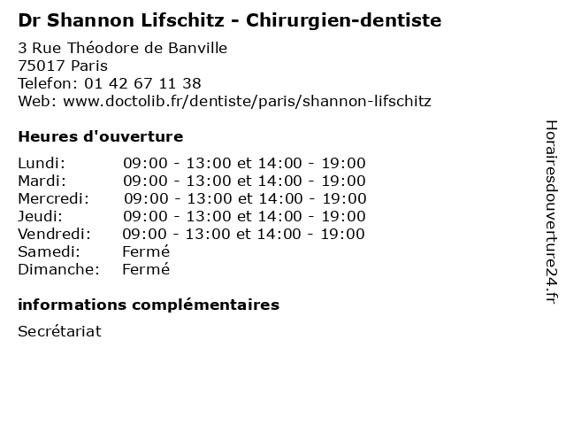 1 Dr Shannon Lifschitz - Chirurgien-dentiste (Distance: 15,27 km) 18 Rue Jean Laugère, 95400 Arnouville chirurgien, dent, dentiste, docteur, dr, lifschitz, shannon, soins 2 Maître Doriane Shannon - Avocate (Distance: 2,50 km) 374 rue Saint Honoré, 75001 Paris avocate, avocats, cabinet, conseils, contentieux, doriane, juridique, justice, litiges, maître, services, shannon 4 Le Shannon Pub (Distance: 4,83 km) 23 rue Bréa, 75006 Paris bar, boissons, cocktail, le, musique, pub, shannon 5 Dr Vincent Shannon - Psychiatre (Distance: 6,29 km) 1 Avenue Jean Moulin, 75014 Paris dr, folie, psychiatre, psychiatrie, psychiatrique, shannon, vincent 6 Clinique Dentaire Wagram (Distance: 0,01 km) 3 rue Théodore de Banville, 75017 Paris clinique, consultations, dentaire, extraction, traitements, wagram |