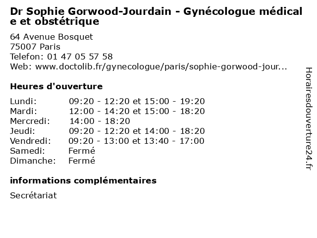 1 Dr Michele Jakubowicz Fraiberger - Gynécologue médical (Distance: 0,10 km) 36 Avenue de la Motte-Picquet, 75007 Paris docteur, dr, fraiberger, gynecologue, gynécologue, jakubowicz, michele, médical, obstretricien, sante 2 Dr Amina Yamgnane - Gynécologue obstétricien (Distance: 0,13 km) 95 Avenue de la Bourdonnais, 75007 Paris amina, consultation, docteur, dr, gynécologue, med, médecin, médecine, obstétricien, secrétariat, traitement, yamgnane 3 Dr Aurélie Benit - Gynécologue obstétricien (Distance: 0,13 km) 95 Avenue de la Bourdonnais, 75007 Paris aurelie, aurélie, bebe, benit, dr, gynecologie, gynécologue, maternite, obstetrique, obstétricien 4 Sophie Deschênes - Masseur-kinésithérapeute (Distance: 0,15 km) 15 Rue du Champ de Mars, 75007 Paris deschênes, kiné, kinésithérapeute, masseur, rééducation, soin, sophie 5 Dr Sylvain Mimoun - Gynécologue médical (Distance: 0,59 km) 15 Rue Jean Nicot, 75007 Paris consultation, docteur, dr, gynécologue, med, mimoun, médecin, médecine, médical, sylvain, traitement 6 Dr Antoine De Gayffier - Gynécologue-obstétricien (Distance: 0,59 km) 41 Boulevard de la Tour-maubourg, 75007 Paris antoine, consultation, de, docteur, dr, gayffier, gynécologue, med, médecin, obstétricien, traitement |