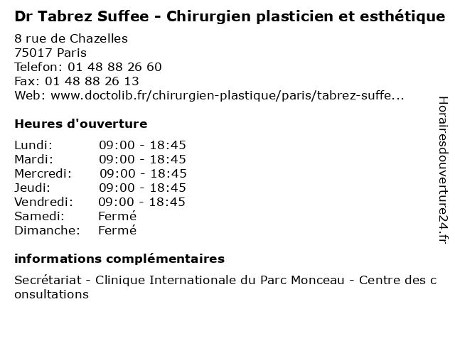 | 1 Dr Tabrez Suffee - Chirurgien plasticien et esthétique (Distance: 4,37 km) 6 Passage Sainte Avoye, 75003 Paris chirurgien, dr, esthétique, et, plasticien, suffee, tabrez 2 Dr Jean Masson - Chirurgien plasticien et esthétique (Distance: 0,03 km) 21 Rue de Chazelles, 75017 Paris chirurgien, dr, esthétique, et, jean, masson, médecin, médecine, médical, pharmaceutique, plasticien, secretariat, traitement 3 Dr Yohann Derhy - Chirurgien plasticien et esthétique (Distance: 0,25 km) 4 Avenue Hoche, 75008 Paris chirurgien, consultation, derhy, docteur, dr, esthétique, et, med, médecin, médecine, plasticien, traitement, yohann 4 Dr Yoni Madar - Chirurgien plasticien et esthétique (Distance: 0,25 km) 4 Avenue Hoche, 75008 Paris chirurgien, consultation, docteur, dr, esthétique, et, madar, med, médecin, médecine, plasticien, traitement, yoni 5 Dr Raphaël Nail-Barthelemy - Chirurgien plasticien et esthétique (Distance: 0,25 km) 4 Avenue Hoche, 75008 Paris barthelemy, chirurgien, consultation, docteur, dr, esthétique, et, med, médecin, médecine, nail, plasticien, raphaël, traitement 6 Dr Corinne Pachet - Chirurgien plasticien et esthétique (Distance: 0,51 km) 21 Rue Balzac, 75008 Paris chirurgien, consultation, corinne, docteur, dr, esthétique, et, med, médecin, médecine, pachet, plasticien, traitement |