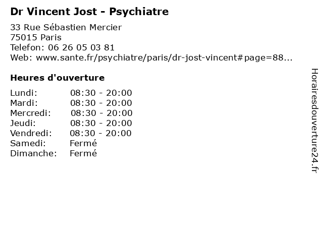 1 Dr Vincent Jost - Psychiatre (Distance: 0,01 km) 33 Rue Sébastien Mercier, 75015 Paris dr, folie, jost, psychiatre, psychiatrie, psychiatrique, vincent 2 Dr Geneviève Wolmark - Psychiatre (Distance: 0,54 km) 91 Rue de Lourmel, 75015 Paris cabinet, consultation, dr, geneviève, psychiatre, psychiatrie, santé, thérapie, wolmark 3 Dr. Danon Nathalie - Psychiatre (Distance: 1,14 km) 26 Rue Boileau, 75016 Paris danon, docteur, dr., medecins, nathalie, psychiatre, sante 4 Dr. Smadja Michèle - Psychiatre (Distance: 4,32 km) . Avenue de Messine, 75008 Paris docteur, dr., medecins, michèle, psychiatre, sante, smadja 5 Dr. Pana Liliana - Psychiatre (Distance: 6,61 km) 28 Avenue Léonard de Vinci -, 92400 Courbevoie docteur, dr., liliana, medecins, pana, psychiatre, sante 6 Dr. Klotz Liliane - Psychothérapeute-Psychiatre (Distance: 8,67 km) 4 Rue Santerre, 75012 Paris docteur, dr., klotz, liliane, medecins, psychiatre, psychothérapeute, sante |