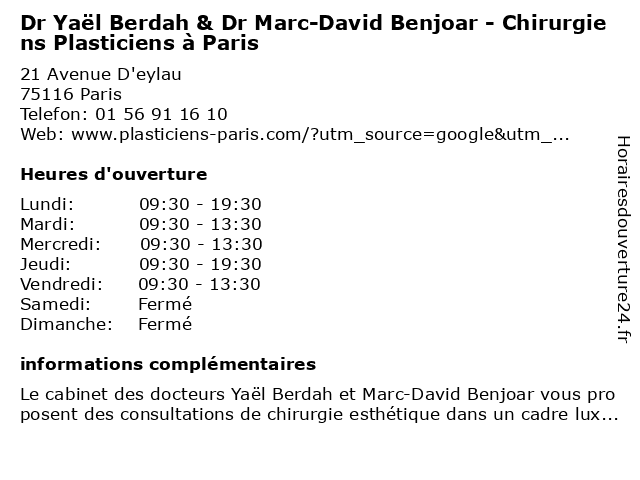 1 Dr Yael Berdah - Chirurgien plasticien et esthétique (Distance: 0,00 km) 21 Avenue d'Eylau, 75116 Paris berdah, chirurgien, chiurgie, dr, esthétique, et, general, plasticien, soins, yael 2 Dr Marc Lalau Keraly - Gynécologue obstétricien (Distance: 0,09 km) 34 Avenue d'Eylau, 75116 Paris consultation, docteur, dr, gynécologue, keraly, lalau, marc, med, médecin, médecine, obstétricien, secrétariat, traitement 3 Maître David-Benjamin Meyer - Avocat (Distance: 0,16 km) 34 Avenue d’Eylau, 75116 Paris avocat, avocats, benjamin, cabinet, conseils, contentieux, david, juridique, justice, litiges, maître, meyer, services 4 Jean Louis David (Distance: 0,17 km) 14 Rue des Sablons, 75016 Paris beaute, coiffure, david, jean, louis 5 Dr Yaël Marciano - Chirurgien-dentiste (Distance: 0,17 km) 6 Place de Mexico, 75016 Paris care, chirurgien, clinic, dentist, dentiste, dr, france, health, marciano, service, yaël 6 Karl Marc John (Distance: 0,18 km) 91 Rue de Longchamp, 75016 Paris chaussures, enfants, femme, john, karl, marc, mode |
