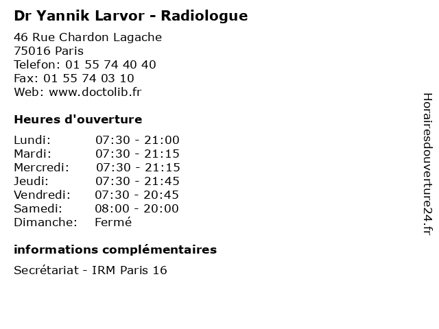 1 Dr Yannik Larvor - Radiologue (Distance: 0,63 km) 95 Rue Michel Ange, 75016 Paris dr, larvor, médecin, médecine, médical, pharmaceutique, radiologue, secretariat, traitement, yannik 2 Dr Yannik Larvor - Radiologue (Distance: 0,63 km) 95 Rue Michel-ange, 75016 Paris diagnostique, dr, imagerie, larvor, radiologie, radiologue, thérapeutique, yannik 3 Dr Yannik Larvor - Radiologue (Distance: 2,06 km) 74 Avenue Paul Doumer, 75116 Paris dr, larvor, médecin, médecine, médical, pharmaceutique, radiologue, secretariat, traitement, yannik 4 Dr Yannik Larvor - Radiologue (Distance: 2,06 km) 74 Avenue Paul Doumer, 75016 Paris diagnostique, dr, imagerie, larvor, radiologie, radiologue, thérapeutique, yannik 5 Dr Yannik Larvor - Radiologue (Distance: 2,07 km) 74 Avenue Paul Doumer, 75016 Paris consultation, docteur, dr, larvor, med, médecin, radiologue, traitement, yannik 6 Sonia Larvor - Ostéopathe (Distance: 17,61 km) 4 place Francis Poulenc, 78180 Montigny-le-Bretonneux bien-être, larvor, ostéopathe, santé, services, sonia |