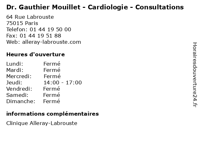 1 Dr. Djamel Hamani - Cardiologie - Consultations (Distance: 0,00 km) 64 Rue Labrouste, 75015 Paris cardiologie, consultations, djamel, docteur, dr., hamani, medecins, sante 2 Dr. Joelle Pozzan - Cardiologie - Consultations (Distance: 0,00 km) 64 Rue Labrouste, 75015 Paris cardiologie, consultations, docteur, dr., joelle, medecins, pozzan, sante 3 Dr. Rabea Touati Khedim - Cardiologie - Consultations (Distance: 0,00 km) 64 Rue Labrouste, 75015 Paris cardiologie, consultations, docteur, dr., khedim, medecins, rabea, sante, touati 4 Dr Guy Pioger - Cardiologie interventionnelle, scanner coronaire - Consultations (Distance: 0,00 km) 64 Rue Labrouste, 75015 Paris cardiologie, consultation, consultations, coronaire, dr, guy, interventionnelle, médecins, médicaments, pioger, santé, scanner, spécialiste 5 Dr Thierry Zerah - Cardiologie (Distance: 0,00 km) 64 Rue Labrouste, 75015 Paris cardiologie, dr, médecins, médicaments, santé, spécialiste, thierry, zerah 6 Michel Zygelman - Cardiologie (Distance: 0,00 km) 64 Rue Labrouste, 75015 Paris cardiologie, michel, médecins, médicaments, santé, spécialiste, zygelman |