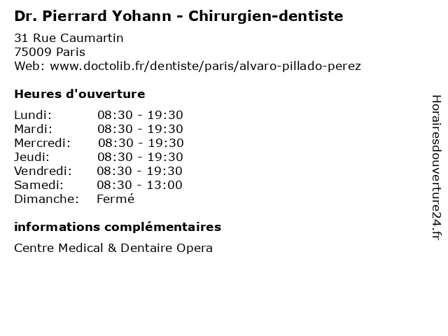 1 Dr Yohann Dabi - Gynécologue obstétricien (Distance: 1,38 km) 7 Rue Bergère, 75009 Paris consultation, dabi, docteur, dr, gynécologue, med, médecin, obstétricien, traitement, yohann 2 Maître Yohann-David Saadoun - Avocat (Distance: 1,46 km) 75 Avenue des Champs-Élysées, 75008 Paris avocat, david, droit, maître, négociation, saadoun, yohann 3 Dr Yohann Derhy - Chirurgien plasticien et esthétique (Distance: 1,88 km) 4 Avenue Hoche, 75008 Paris chirurgien, consultation, derhy, docteur, dr, esthétique, et, med, médecin, médecine, plasticien, traitement, yohann 4 Dr Yohann Knafo - Chirurgien orthopédiste et traumatologue (Distance: 1,93 km) 8 Rue de Chazelles, 75017 Paris chirurgie, chirurgien, dr, et, general, knafo, orthopédiste, soins, traumatologue, yohann 5 Dr Yohann Bohu - Chirurgien orthopédiste (Distance: 2,06 km) 23 Rue Brochant, 75017 Paris bohu, chirurgien, consultation, docteur, dr, med, médecin, médecine, orthopédiste, secrétariat, traitement, yohann 6 Maître Louis-Emmanuel Pierrard - Avocat (Distance: 2,43 km) 47 rue Dumont d'Urville, 75116 Paris avocat, avocats, cabinet, conseils, contentieux, emmanuel, juridique, justice, litiges, louis, maître, pierrard, services |