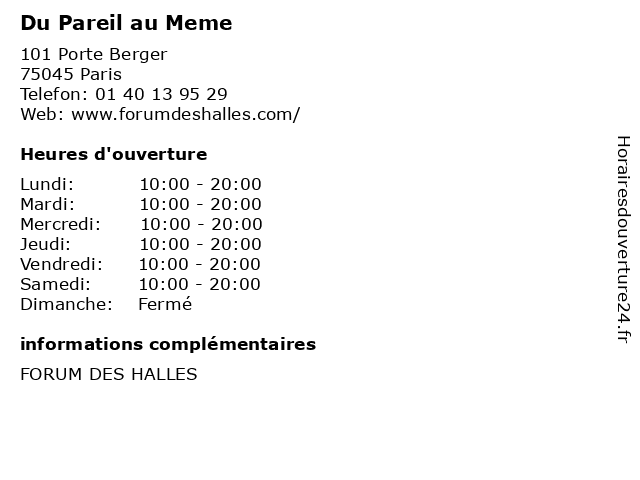 1 Du Pareil Au Meme (Distance: 3,81 km) 30 Avenue d'Italie, 75013 Paris au, centre, chaussures, du, enfants, meme, pareil, vêtements 2 Du Pareil au Meme (Distance: 5,19 km) 23 Rue Madeleine Vionnet, 93300 Aubervilliers alimentation, au, beauté & sante, culture & loisirs, du, enfants, high-tech, maison & déco, meme, mode, pareil, restaurants 3 Du Pareil Au Meme (Distance: 5,82 km) 63 Avenue de Fontainebleau, 94270 Le Kremlin-Bicêtre au, cafe, chaussures, du, enfants, homme, meme, mode femme, pareil, parfumeries, restaurant, servicies, sport 4 Du Pareil au Meme (Distance: 9,92 km) . Avenue du Général-de-Gaulle, 93117 Rosny-Sous-Bois au, beaute, cafe, chaussures, du, enfants, meme, mode femmes, mode hommes, pareil, restaurant, sport 5 Du Pareil au Meme (Distance: 12,11 km) 3 De La Resistance, 94324 Thiais au, cafe, du, enfants.chaussures, lingerie, meme, mode hemmes, mode homme, pareil, restaurant 6 Du Pareil Au Meme (Distance: 12,71 km) 2 Avenue de L'Europe, 78140 Vélizy-Villacoublay accessoires, au, chaussures, du, enfant, meme, mode, pareil, vêtements |