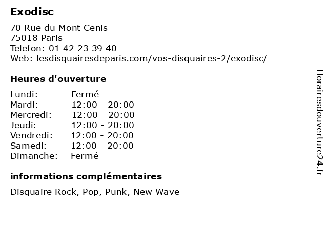 1 Dizonord - Le Disquaire de la Zone Nord (Distance: 0,42 km) 9 rue André Messager, 75018 Paris collection, de, disquaire, disques, dizonord, la, le, nord, vinyl, zone 2 Soul Ableta Disquaire (Distance: 0,51 km) 47 Rue Marcadet, 75018 Paris ableta, collection, disquaire, disques, soul, vintage, vynil 3 Centre contrôle technique DEKRA (Distance: 0,66 km) 154 Rue Damrémont, 75018 Paris 4x4, camping car, centre, collection, contrôle, dekra, diesel, electrique, essence, gazole, suv, technique, utilitaire, voiture 4 S.j.p. Sasu (Distance: 0,66 km) 88 Rue Myrha, 75018 Paris cassettes, disques, distribution, magasins, production, préenregistrées 5 Le Rideau de Fer (Distance: 0,66 km) 12 rue André Del Sarte, 75018 Paris collection, de, disquaire, disques, fer, le, rideau, vinyl 6 Arsène et les Pipelettes (Distance: 0,91 km) 2 Rue des Trois Frères, 75018 Paris arsène, collection, et, les, nouvelle, pipelettes |