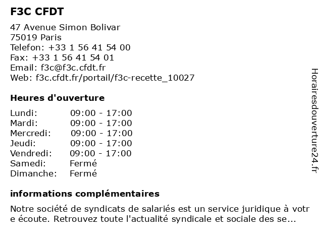 5 CFDT SEINE SAINT DENIS (Distance: 7,73 km) 1 Rue de la Libération, 93000 Bobigny cfdt, denis, saint, seine 6 SPAC CFDT - Syndicat des Personnels de l'Aviation Civile (Distance: 9,20 km) 50 rue Henry Farman, 75720 Paris aviation, cfdt, civile, de, des, l'aviation, personnels, spac, syndicat |