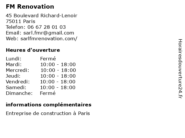 | 2 Urban Renovation (Distance: 1,15 km) 40 Rue des Blancs Manteaux, 75004 Paris batiment, devis, renovation, superficie, travaux, urban 4 Vivre FM (Distance: 4,12 km) 51 Rue René Clair, 75018 Paris actu, culture, fm, humour, musique, paris, radio, vivre 5 Espace FM (Distance: 6,11 km) 92-98 Boulevard Victor Hugo, 92110 Clichy actualité, clichy, espace, fm, musique, radio 6 Mc2 Renovation (Distance: 6,37 km) 7 Rue Scheffer, 75016 Paris bricolage, carreleur, constructeur, entreprise générale de construction, mc2, plombier, renovation |