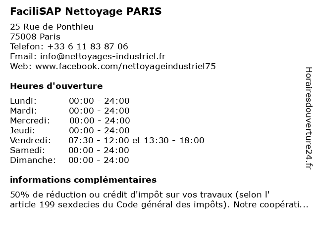 1 FaciliSAP Nettoyage PARIS (Distance: 0,21 km) 128 Rue La Boétie, 75008 Paris facilisap, nettoyage, paris 2 FaciliSAP Nettoyage PARIS (Distance: 0,33 km) 59 Rue de Ponthieu, 75008 Paris facilisap, nettoyage, paris 3 FaciliSAP Nettoyage PARIS (Distance: 1,56 km) 12 Rue Ernest Psichari, 75007 Paris facilisap, nettoyage, paris 4 5 FaciliSAP Nettoyage PARIS (Distance: 4,84 km) 100 Rue d'Aubervilliers, 75019 Paris facilisap, nettoyage, paris 6 FaciliSAP Nettoyage PARIS (Distance: 6,68 km) 223 Rue des Pyrénées, 75020 Paris facilisap, nettoyage, paris |