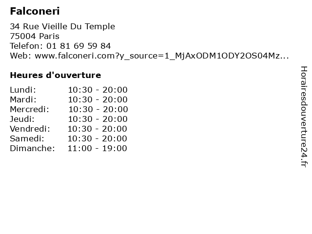 1 Falconeri (Distance: 0,64 km) 92 Rue De Rivoli, 75004 Paris falconeri, magasin de vêtements pour femmes, magasin de vêtements pour hommes 2 Falconeri (Distance: 2,09 km) 56 Rue Du Four, 75006 Paris falconeri, magasin de vêtements pour femmes, magasin de vêtements pour hommes 3 Falconeri (Distance: 2,79 km) 10 Rue Tronchet, 75008 Paris falconeri, magasin de vêtements pour femmes, magasin de vêtements pour hommes 4 Falconeri (Distance: 5,03 km) 6 Avenue Des Ternes, 75017 Paris falconeri, magasin de vêtements pour femmes, magasin de vêtements pour hommes 5 Falconeri (Distance: 5,70 km) 48 Rue De Passy, 75016 Paris falconeri, magasin de vêtements pour femmes, magasin de vêtements pour hommes 6 Falconeri (Distance: 30,62 km) 14 Cours Du Danube, 77700 Serris falconeri, magasin de vêtements pour femmes, magasin de vêtements pour hommes |