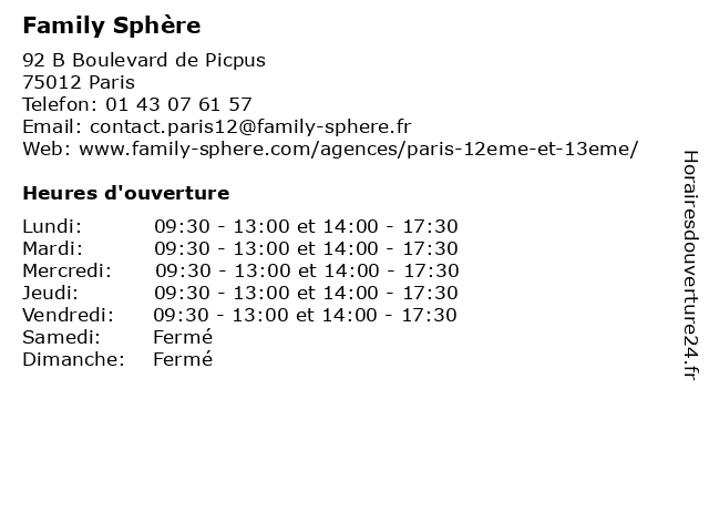 1 Family Sphère (Distance: 1,66 km) 158 Boulevard Voltaire, 75011 Paris agence, aide, domicile, family, personne, seniors, services, sphère 2 Family Sphère (Distance: 19,78 km) 64 Rue des Chantiers, 78000 Versailles agence, domicile, enfants, family, garde, nounous, sphère 4 Family Sphere (Distance: 1,20 km) 223 Rue de Charenton, 75012 Paris family, garde d'enfants, services, soutien scolaire, sphere 5 Citeaux Sphère (Distance: 1,48 km) 45 Rue de Citeaux, 75012 Paris aux, boutique, citeaux, restaurants, sphere, sphère 6 Family Sphere (Distance: 1,60 km) 161 Rue du Faubourg Saint-Antoine, 75011 Paris family, garde d'enfants, services, soutien scolaire, sphere |
