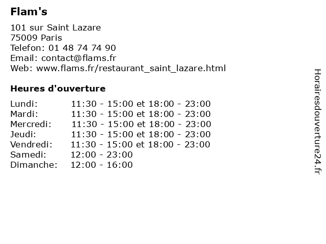 1 Flam's (Distance: 1,11 km) 11 boulevard Montmartre, 75002 Paris boissons, flam's, nourriture, restaurant 5 Flam and Design (Distance: 25,19 km) 4 Allée Saint-Fiacre, 91620 La ville-du-Bois and, cheministe, design, flam, la ville-du-bois 6 Pomme de Pain (Distance: 0,05 km) 66 Rue de Caumartin, 75009 Paris boissons, de, desserts, nourriture, pain, pomme, pâtisseries, restaurant, salades, sandwichs |