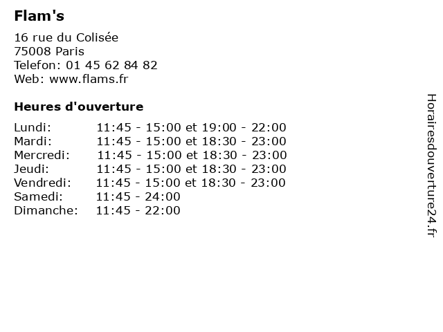 1 2 Flam's (Distance: 2,43 km) 11 boulevard Montmartre, 75002 Paris boissons, flam's, nourriture, restaurant 5 Flam and Design (Distance: 24,46 km) 4 Allée Saint-Fiacre, 91620 La ville-du-Bois and, cheministe, design, flam, la ville-du-bois 6 Restaurant O'31 (Distance: 0,05 km) 31 rue de Ponthieu, 75008 Paris boissons, bowl, o'31, poké, restaurant, salade |