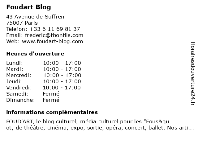 1 Yes We Blog - Griselidis GAILLET (Distance: 6,99 km) 55 Rue Lehot, 92600 ASNIERES SUR SEINE blog, développeur de sites web, gaillet, griselidis, we, yes 2 FOU DE THÉÂTRE (Distance: 0,00 km) 43 Avenue de Suffren, 75007 Paris art, ballet, ciné, de, film cinema, fou, interview, opera, peintre, peinture, sortie cinema, thÉÂtre, théâtre 3 Galerie Kasah (Distance: 0,10 km) 62 Avenue de Suffren, 75015 Paris art, artworks, culture, culturel, expositions, galerie, kasah 4 Maison de la Vie Associative et Citoyenne du 7e arrondissement (Distance: 0,98 km) 4 rue Amélie, 75007 Paris 7e, arrondissement, associative, citoyenne, culturel, culturels, de, du, et, la, maison, projets, service, vie 5 Centre Culturel Coréen (Distance: 1,05 km) 2 Avenue d'Iena, 75116 Paris affaires, centre, coreen, coréen, culturel, internationales 6 Centre Culturel Coréen - Bibliothèque (Distance: 1,05 km) 2 Avenue d'Iéna, 75116 Paris bibliothèque, centre, coréen, culturel, livre, médiathèque, services, ville |
