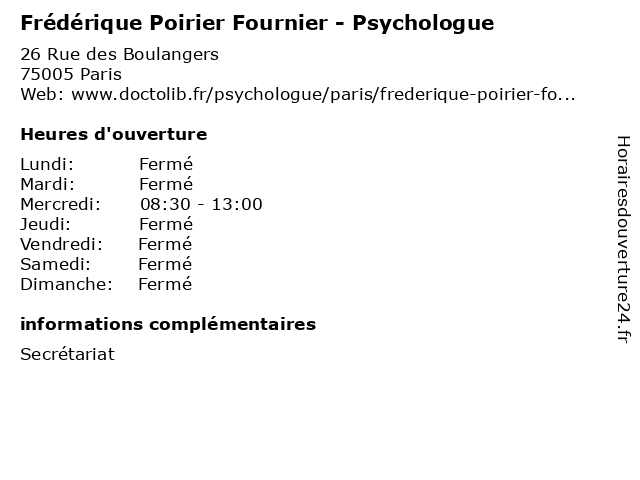 1 Maître Frédérique Barthalais - Avocate (Distance: 0,78 km) 11 rue Soufflot, 75005 Paris avocate, avocats, barthalais, cabinet, conseils, contentieux, frédérique, juridique, justice, litiges, maître, services 2 Frédérique Teurnier - Échographiste (Distance: 1,20 km) 139 Boulevard Saint-Michel, 75005 Paris docteur, frédérique, médecin, teurnier, Échographiste, échographie, échographiste 3 Jean-Baptiste Poirier - Ostéopathe (Distance: 2,04 km) 26 Rue de la Chaise, 75007 Paris baptiste, care, clinic, dentist, france, gynécologue, health, jean, kinesitherapeute, ophtalmologiste, orl, ostéopathe, poirier, psychologue, service 4 Fournier Delphine (Distance: 2,19 km) 86 Boulevard De Sebastopol, 75003 Paris delphine, fournier, restaurants 5 Frédérique Doye - Psychologue (Distance: 2,64 km) 19 bis Passage du Génie, 75012 Paris cabinets, doye, frédérique, médecins, psychologue, secrétariat, thérapies 6 Frédérique Heurtel - Avocate (Distance: 3,25 km) 4 Place Édouard VII, 75009 Paris avocat, avocate, avocats, droit, frédérique, heurtel, lois, service |