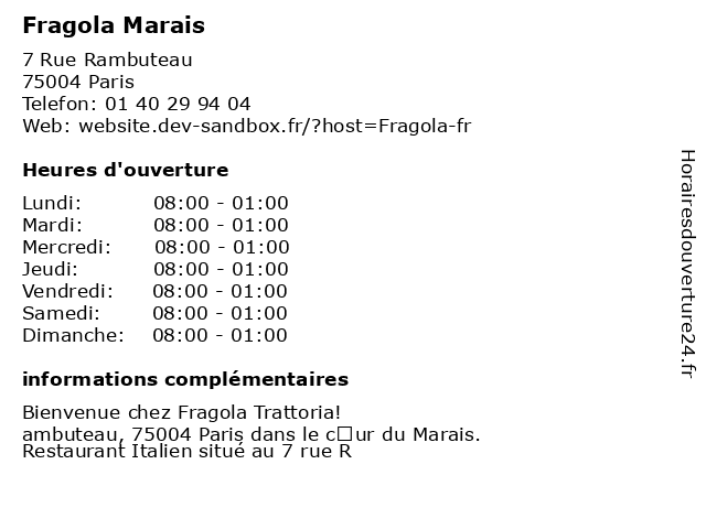 1 Bijouterie du Marais (Distance: 0,03 km) 3 Rue Rambuteau, 75004 Paris bijouterie, bijoux, diamants, du, marais, montres, or 2 Bioburger Le Marais (Distance: 0,04 km) 13 Rue Rambuteau, 75004 Paris bioburger, fast-food, le, marais, restaurant américain, restaurant végétarien, restaurants 3 L'Opticien du Marais (Distance: 0,04 km) 41 Rue des Archives, 75004 Paris du, l'opticien, lunettes, marais, monture, opticien, optique, solaire, vue 4 Eglantine Fleurs Le Marais (Distance: 0,06 km) 15 Rue Rambuteau, 75004 Paris arrangements, bouquets, eglantine, fleuriste, fleurs, le, marais 5 Au Coeur du Marais (Distance: 0,07 km) 56 Rue Des Archives, 75004 Paris au, bar, boissons, cocktail, coeur, du, marais, musique, pub, restauran 6 Le Traiteur Du Marais - siège social (Distance: 0,08 km) 40 Rue Des Blancs Manteaux, 75004 Paris boissons, du, le, marais, nourriture, restaurant, service, siège, social, traiteur |