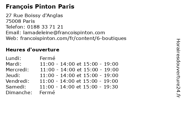 | Vendredi | 11:00-14:00 et 15:00-19:00 |