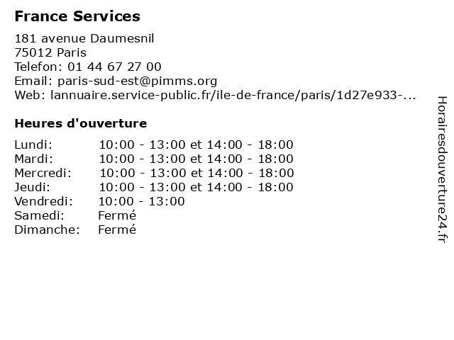 1 France Services (Distance: 2,45 km) 18 rue Ramus, 75020 Paris administration, communes, france, service, services, services publics 2 France Services (Distance: 5,50 km) 3 bis rue Jacques-Kablé, 75018 Paris administration, au, de, est, france, maison, nord, organismes, paris, public, publics, services 3 France Services (Distance: 6,62 km) 4 Rue de Lattre de Tassigny, 94130 Nogent-sur-Marne associations, france, maison, services 4 France Services (Distance: 6,75 km) 5 Avenue de la Porte d'Aubervilliers, 75018 Paris administration, communes, france, service, services, services publics 5 France Services (Distance: 7,63 km) 11 Avenue de la Porte-de-Montmartre, 75018 Paris administration, communes, france, service, services, services publics 6 France Services (Distance: 8,90 km) 105 Avenue du Général Leclerc, 92340 Bourg-La-Reine associations, france, maison, services |