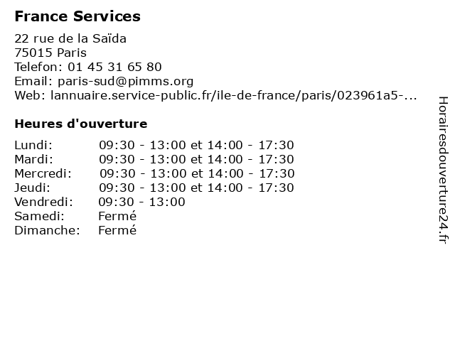 1 France Services (Distance: 6,06 km) 105 Avenue du Général Leclerc, 92340 Bourg-La-Reine associations, france, maison, services 2 France Services (Distance: 6,72 km) 11 Impasse Genouville, 92300 Levallois-Perret associations, france, maison, services 3 France Services (Distance: 7,20 km) 1456 Avenue Roger Salengro, 92370 Chaville associations, france, maison, services 4 France Services (Distance: 10,29 km) 1 Place des Baconnets, 92160 Antony associations, france, maison, services 5 France Services (Distance: 10,42 km) 6 Place Louis Aragon, 92700 Colombes associations, france, maison, services 6 France Services (Distance: 11,30 km) 6 Rue Hector Berlioz, 92390 Villeneuve-la-Garenne associations, france, maison, services |