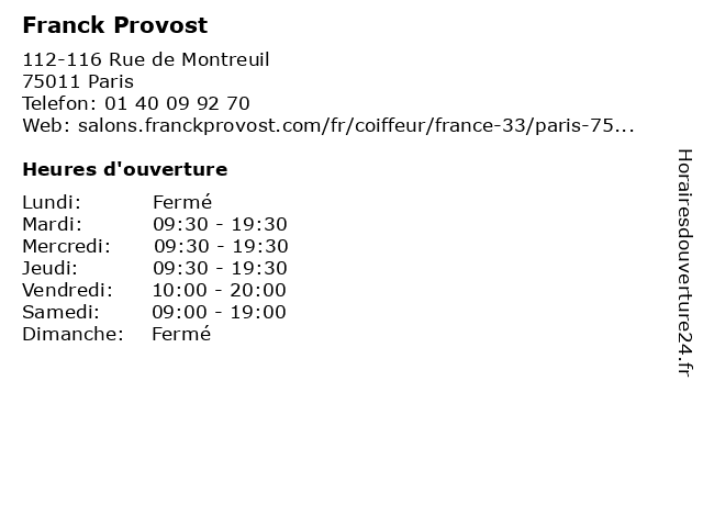 1 Franck Provost (Distance: 0,92 km) 40 Rue de Reuilly, 75012 Paris beauté, cheveux, coiffure, franck, provost, salon, service 2 Franck Provost (Distance: 1,37 km) 207 Avenue Daumesnil, 75012 Paris beauté, cheveux, coiffure, franck, provost, salon, service 3 Franck Provost (Distance: 1,37 km) 235 Rue Etienne Marcel, 93556 Montreuil coiffeur, coiffure, franck, provost, salon 4 Franck Provost (Distance: 1,93 km) 10 Rue de Dijon, 75012 Paris beauté, cheveux, coiffure, franck, provost, salon, service 5 Franck Provost (Distance: 3,56 km) 30 Boulevard Paul Vaillant Couturier, 94262 Ivry-sur-Seine coiffeur, coiffure, franck, provost, salon 6 Franck Provost (Distance: 4,13 km) 48 BOULEVARD SAINT-MICHEL,, 75006 PARIS expertise beauté, franck, la marque, provost, tendance coiffure, événement |