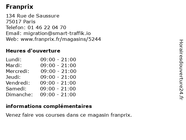 1 Franprix (Distance: 0,31 km) 72 Rue Mstislav Rostropovitch, 75017 Paris bibi, carte de fidelite, courses, franprix, magasin, produits frais, programme de fidélité, supermarché, épicerie 2 Franprix (Distance: 0,40 km) 10 Rue Nicolas Chuquet, 75017 Paris bibi, carte de fidélité, courses, franprix, magasin, produits frais, programme de fidélité, supermarché, épicerie 4 Franprix (Distance: 0,59 km) 158 rue Cardinet, 75017 Paris alimentaire, alimentation, courses, franprix, supermarché, supérette, épicerie 5 Franprix (Distance: 0,63 km) 126 Boulevard Berthier, 75017 Paris bibi, carte de fidélité, courses, franprix, magasin, produits frais, programme de fidélité, supermarché, épicerie 6 Franprix (Distance: 0,75 km) 25 bd Henri, 75017 PARIS alimentation générale, entretien de la maison et de l'hygiène, franprix, franprix magasin, fruits et légumes frais |