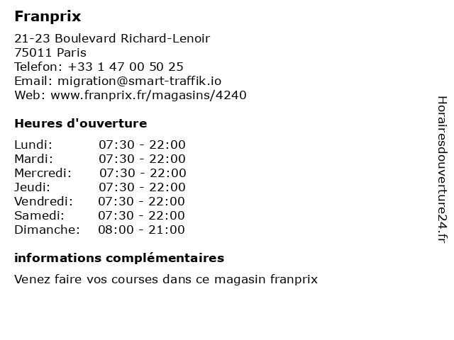 1 Franprix (Distance: 0,08 km) 8 Rue du Chemin Vert, 75011 Paris bibi, carte de fidélité, courses, franprix, magasin, produits frais, programme de fidélité, supermarché, épicerie 2 Franprix (Distance: 0,27 km) 25 Rue de la Roquette, 75011 Paris bibi, carte de fidélité, courses, franprix, magasin, produits frais, programme de fidélité, supermarché, épicerie 3 Franprix (Distance: 0,88 km) 142 rue de la Roquette, 75011 Barisis bibi, carte de fidélité, courses, franprix, magasin, produits frais, programme de fidélité, supermarché, épicerie 4 Franprix (Distance: 1,18 km) 105 Avenue Parmentier, 75011 Paris bibi, carte de fidélité, courses, franprix, magasin, produits frais, programme de fidélité, supermarché, épicerie 6 Franprix (Distance: 1,65 km) 113-115 Faubourg du Temple, 75010 PARIS alimentation générale, entretien de la maison et de l'hygiène, franprix, franprix magasin, fruits et légumes frais |