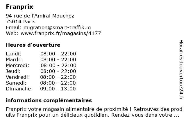 1 Franprix (Distance: 0,18 km) 30-32 Rue de Rungis, 75013 Paris bibi, carte de fidélité, courses, franprix, magasin, produits frais, programme de fidélité, supermarché, épicerie 2 Franprix (Distance: 0,31 km) 5 Place de Rungis, 75013 Paris bibi, carte de fidélité, courses, franprix, magasin, produits frais, programme de fidélité, supermarché, épicerie 3 Franprix (Distance: 0,77 km) 121 Rue de la Glacière, 75013 Paris bibi, carte de fidélité, courses, franprix, magasin, produits frais, programme de fidélité, supermarché, épicerie 4 Franprix (Distance: 0,87 km) 25 av Raspail, 94250 GENTILLY alimentation générale, entretien de la maison et de l'hygiène, franprix, franprix magasin, fruits et légumes frais 5 Franprix (Distance: 1,17 km) 137 Boulevard Auguste Blanqui, 75013 Paris bibi, carte de fidélité, courses, franprix, magasin, produits frais, programme de fidélité, supermarché, épicerie 6 Franprix (Distance: 1,31 km) 5 Rue Dareau, 75014 Paris bibi, carte de fidélité, courses, franprix, magasin, produits frais, programme de fidélité, supermarché, épicerie  |