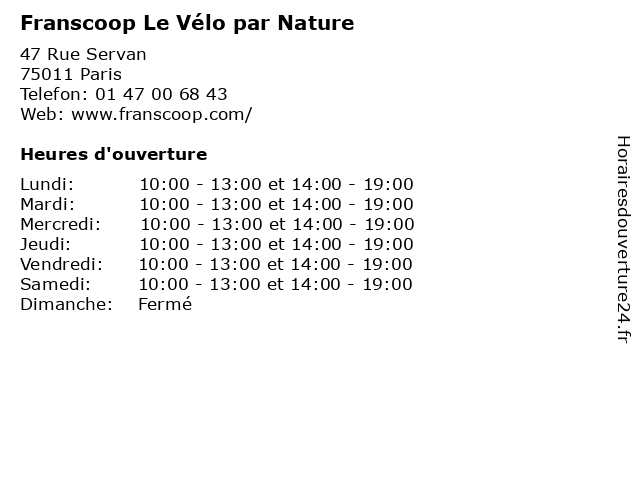 | Mercredi | 10:00-13:00 et 14:00-19:00 |