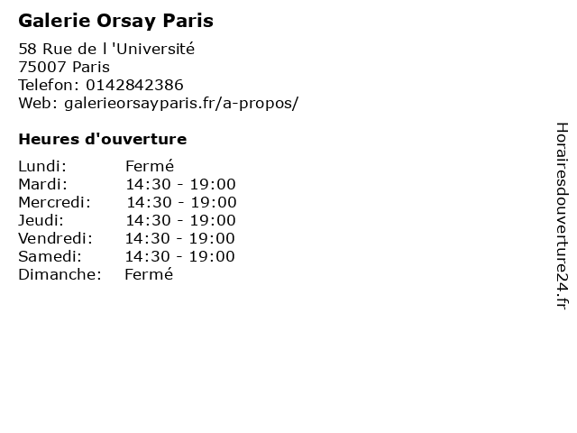 1 Galerie Orenda (Distance: 0,07 km) 54 Rue De Verneuil, 75007 Paris art, artistes, expositions, galerie, galeries, orenda, œuvres 2 Luggage Storage Museum of Orsay - Radical Storage (Distance: 0,11 km) 24 Rue du Bac, 75007 Paris luggage, luggage storage, luggage storage near me, museum, of, orsay, radical, storage 3 Luggage Storage near Museum of Orsay - Radical Storage (Distance: 0,11 km) 24 Rue du Bac, 75007 Paris luggage, luggage storage, luggage storage near me, museum, near, of, orsay, radical, storage 4 Galerie Lefebvre & Fils (Distance: 0,12 km) 24 Rue du Bac, 75007 Paris art, artiste, expositions, fils, galerie, lefebvre 5 Nannybag Luggage Storage - Musée d'Orsay (Distance: 0,12 km) 20 Rue Du Bac, 75007 Paris d'orsay, luggage, musée, nannybag, storage 6 Maisons de Parfums d'Orsay (Distance: 0,17 km) 44 rue du Bac, 75007 Paris boutique, d'orsay, de, des, germain, homme, maisons, parfumerie, parfums, paris 7, prés, saint |