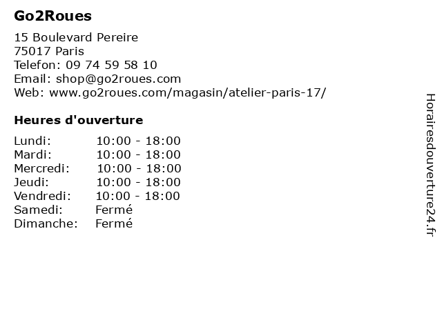 1 Go2Roues (Distance: 2,13 km) 15 avenue de la grande armée, 75016 Paris batteries, go2roues, magasin, réparation, scooter, électrique 2 Go2Roues (Distance: 3,82 km) 13 avenue Duquesne, 75007 Paris batteries, go2roues, magasin, réparation, scooter, électrique 3 Go2Roues (Distance: 5,13 km) 90 boulevard Beaumarchais, 75011 Paris batteries, go2roues, magasin, réparation, scooter, électrique 4 Go2Roues (Distance: 5,77 km) 4 rue Brissac, 75004 Paris batteries, go2roues, magasin, réparation, scooter, électrique 5 Yespark (Distance: 0,16 km) 124 Rue Cardinet, 75017 Paris parking, parking couvert, parking gratuit, parking moto, parking pour professionnel, parking scooter, parking souterrain, parking sécurisé, parking vélo, yespark 6 12.5 - Parking Vélo et deux Roues (Distance: 0,37 km) 6 rue Daubigny, 75017 Paris 12.5, deux, deux roues, et, moto, parking, roues, route, scooter, stationnement, vélo, vélos |