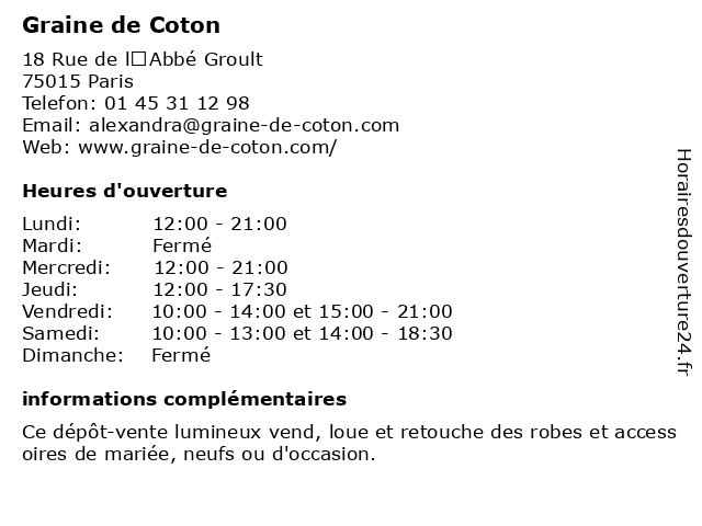 | Samedi | 10:00-13:00 et 14:00-18:30 |