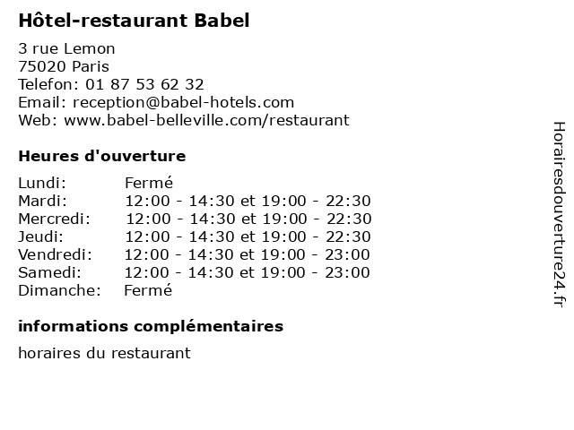 | Mardi | 12:00-14:30 et 19:00-22:30 |