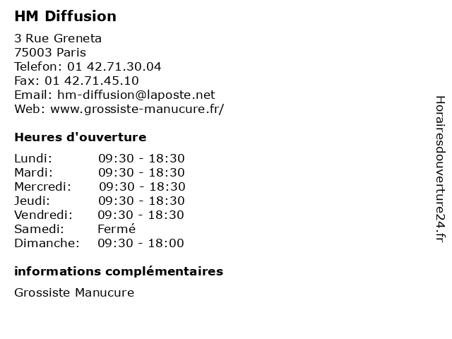 1 Ds Diffusion France Mercerie (Distance: 0,30 km) 7 Rue De Tracy, 75002 Paris diffusion, ds, france, mercerie, rideaux, tapissiers 2 DIFFUSION TOUS MOYENS COMMUNICATION (Distance: 0,98 km) 145 Rue Amelot, 75011 Paris 11ème communication, diffusion, moyens, tous 3 Denaive Diffusion (Distance: 1,65 km) Juillet 7 Rue Du 29, 75001 Paris bijouteries, denaive, diffusion 4 Rev Diffusion (Distance: 3,25 km) Gobelins 28 Avenue Des, 75013 Paris accessoires, diffusion, divers, habillement, magasins, rev 6 HM Partners (Agence commerciale) (Distance: 3,96 km) 39 rue Navier, 75017 Paris agence, commerciale, hm, magasins, partners, réparations, services, smartphone  |