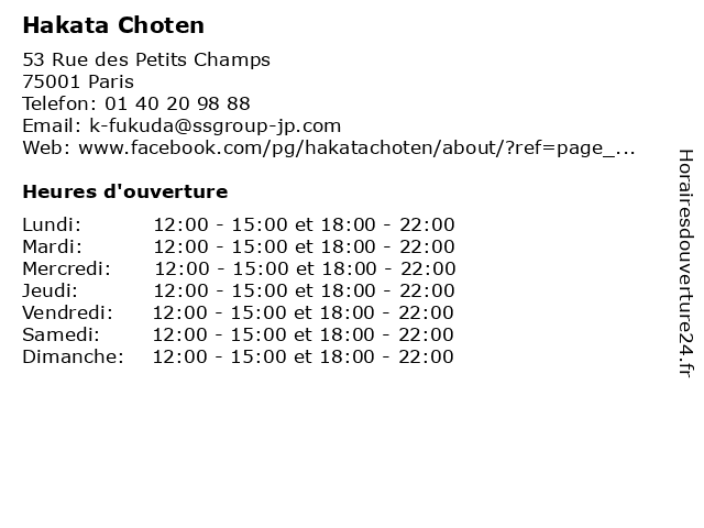 | Dimanche | 12:00-15:00 et 18:00-22:00 |
