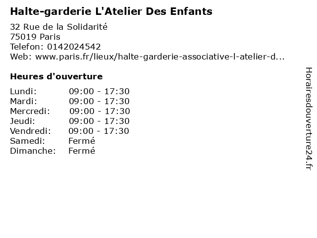 1 Halte-Jeu Municipale le Jardin d'Agate (Distance: 0,65 km) 8 Rue Emile Augier, 93310 Le Pré-Saint-Gervais accueil, creche, d'agate, enfant, garde, garderie, halte, jardin, jeu, le, municipale, éveil 2 Halte-garderie municipale Eugenie Cotton (Distance: 0,68 km) 5 Rue Euggénie Cotton, 75019 Paris 19ème, cotton, crèche, crèches, eugenie, eugénie, garderie, halte, municipale, services, services à la personne 3 Halte-garderie municipale Henri Ribière (Distance: 0,88 km) 10 Rue Henri Ribière, 75019 Paris 19ème, crèches, garderie, halte, henri, municipale, ribière, services, services à la personne 4 Halte-garderie Orh Eliahou (Distance: 0,91 km) 17 Rue de Thionville, 75019 Paris crèches, eliahou, garderie, halte, orh, services, services à la personne 5 Atelier Vents et Courbes (Distance: 0,97 km) 33 Rue Danton, 93310 Le Pré-Saint-Gervais atelier, courbes, et, vents 6 LAPE Lieu d'accueil parents enfants - périodes scolaires (Distance: 1,21 km) 21/23 rue Jules-Jaquemin, 93310 Le Pre Saint-Gervais d'accueil, de parole, enfants, et d'échanges, lape, lieu, lieu d'accueil parents enfants, lieu d'écoute, parents, périodes, scolaires |
