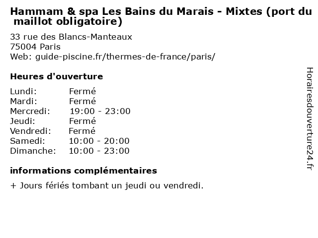 Termes de recherche pour Hammam & spa Les Bains du Marais - Mixtes (port du maillot obligatoire):du, les, bains, port, marais, maillot, spa, sauna, massages, aquabike, aquabiking, hammam, mixtes, obligatoire |