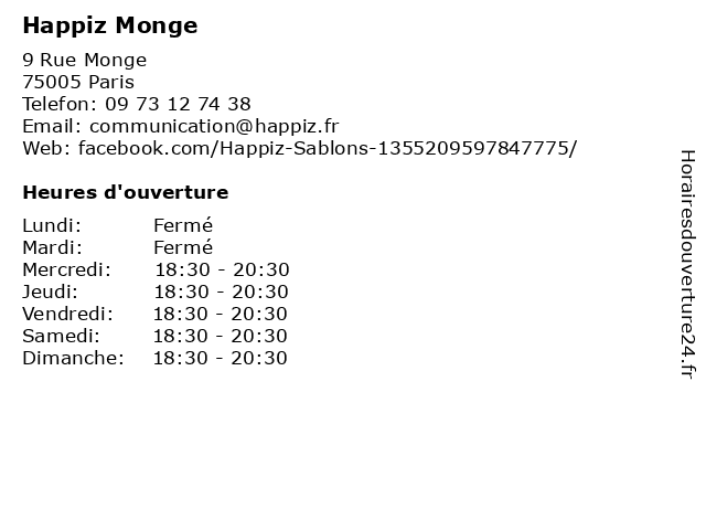 1 Biocoop Monge (Distance: 0,18 km) 17 Rue Monge, 75005 Paris alimentation, biocoop, cosmétiques, fruits, légumes, monge 2 Salon Beauté Monge (Distance: 0,22 km) 23 Rue Monge, 75005 Paris beauty, beauté, institut, makeup, monge, salon, studio 3 Pharmacie Monge (Distance: 0,30 km) 29 Rue Monge, 75005 Paris herboristerie, monge, médicaments, paramédical, parapharmacie, pharmacie, pharmacien, santé, traitements 4 Marché Monge (Distance: 0,69 km) n/a place monge, 75005 Paris equipement, l'heure, livre, marché, monge, médiathèque, services 5 Tabac Place Monge (Distance: 0,73 km) 77 rue Monge, 75005 Paris bar, cigarettes, jeux, journaux, monge, papeterie, place, presse, restauration, tabac 6 Parking Monge - Saesmes (Distance: 0,75 km) 17 rue Gracieuse, 75005 Paris monge, parking, saesmes, stationnement |