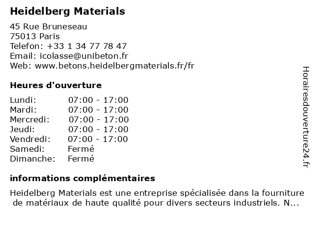 1 Centre de distribution Heidelberg Materials de Bruneseau (Distance: 0,01 km) 45 Rue Bruneseau, 75013 Paris bruneseau, centre, de, distribution, heidelberg, materials 2 Centrale à béton Heidelberg Materials d'Ivry-sur-Seine (Distance: 0,64 km) 29 Quai Marcel Boyer, 94200 Ivry-sur-Seine béton, centrale, d'ivry, heidelberg, materials, seine, sur 3 Centrale à béton Heidelberg Materials de Bonneuil (Distance: 8,60 km) 9 Route de l'Île Saint-Julien, 94380 Bonneuil-sur-Marne bonneuil, béton, centrale, de, heidelberg, materials 4 Centrale à béton Heidelberg Materials d'Issy-les-Moulineaux (Distance: 8,99 km) 103 Quai du Président Roosevelt, 92130 Issy-les-Moulineaux béton, centrale, d'issy, heidelberg, les, materials, moulineaux 5 Centrale à béton Heidelberg Materials d'Aubervilliers (Distance: 9,09 km) 1 Rue Madeleine Vionnet, 93300 Aubervilliers béton, centrale, d'aubervilliers, heidelberg, materials 6 Centrale à béton Heidelberg Materials de Clichy (Distance: 11,22 km) 30 Quai de Clichy, 92110 Clichy béton, centrale, clichy, de, heidelberg, materials |