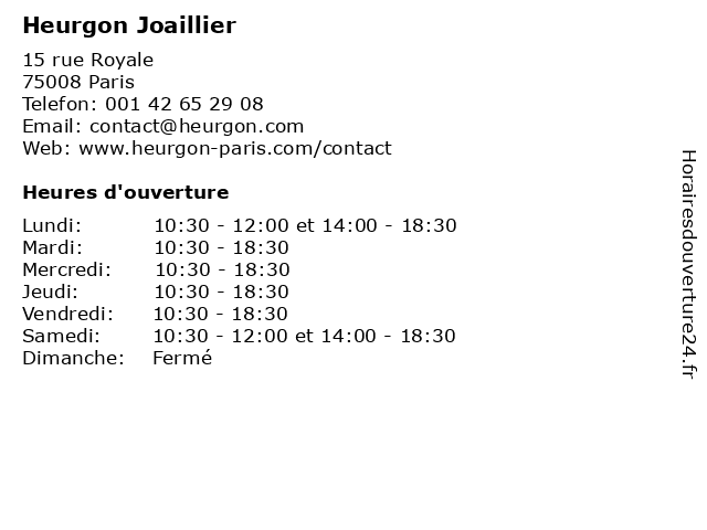 1 Heurgon Joaillier (Distance: 0,20 km) 23-25 Rue du Faubourg Saint-Honoré, 75008 PARIS accessoires, bijoux, heurgon, joaillier, magasin de montres, montre 5 Wempe Paris - Horloger & Joaillier (Distance: 0,17 km) 16 Rue Royale, 75008 Paris bijouterie, bijoutier, horloger, joaillier, paris, réparation de bijoux, wempe 6 Jallamion Debricon Joaillier (Distance: 0,84 km) 19 Rue La Boétie, 75008 Paris bagues, bijouterie, bijoux, colliers, debricon, entreprise, jallamion, joaillier, perles, société |
